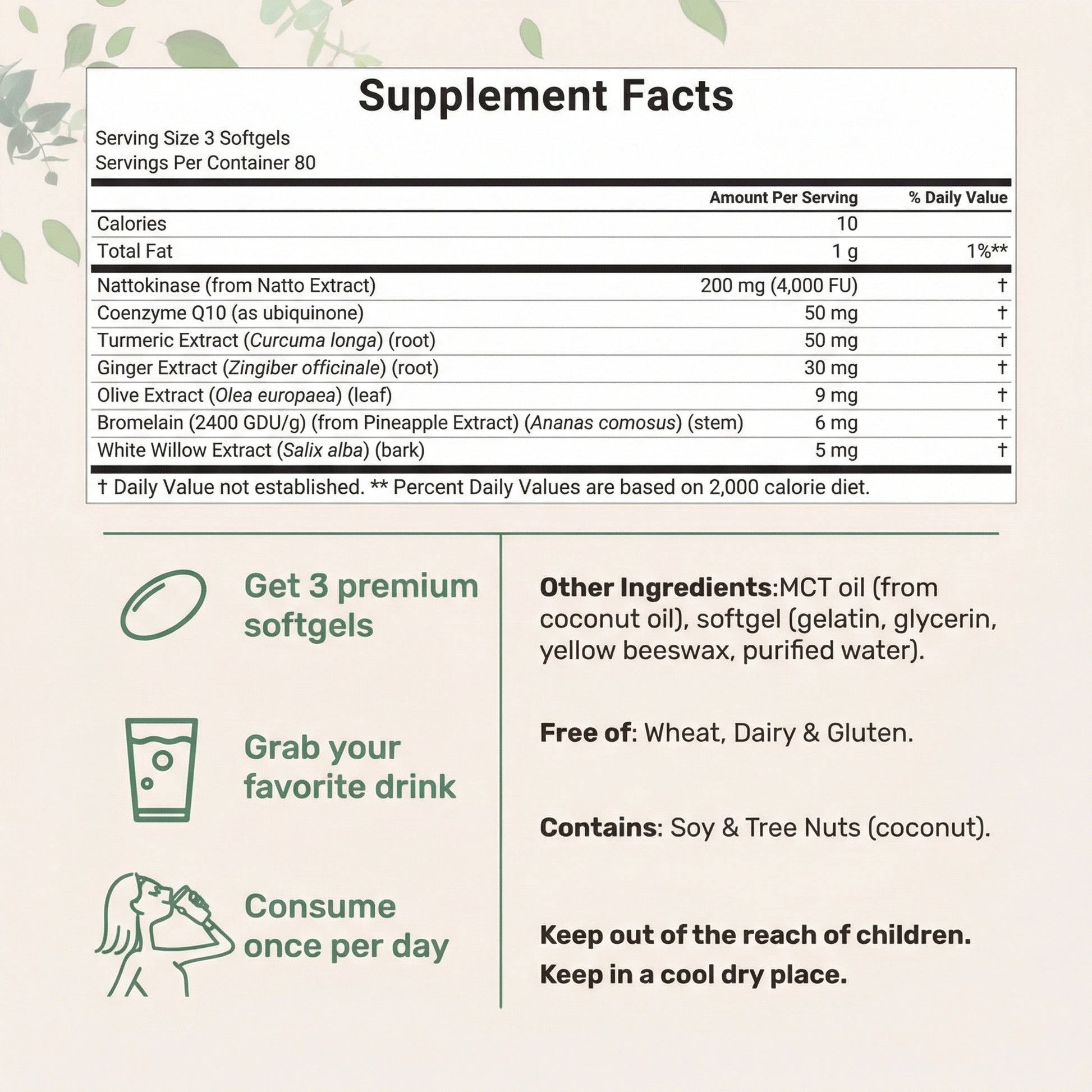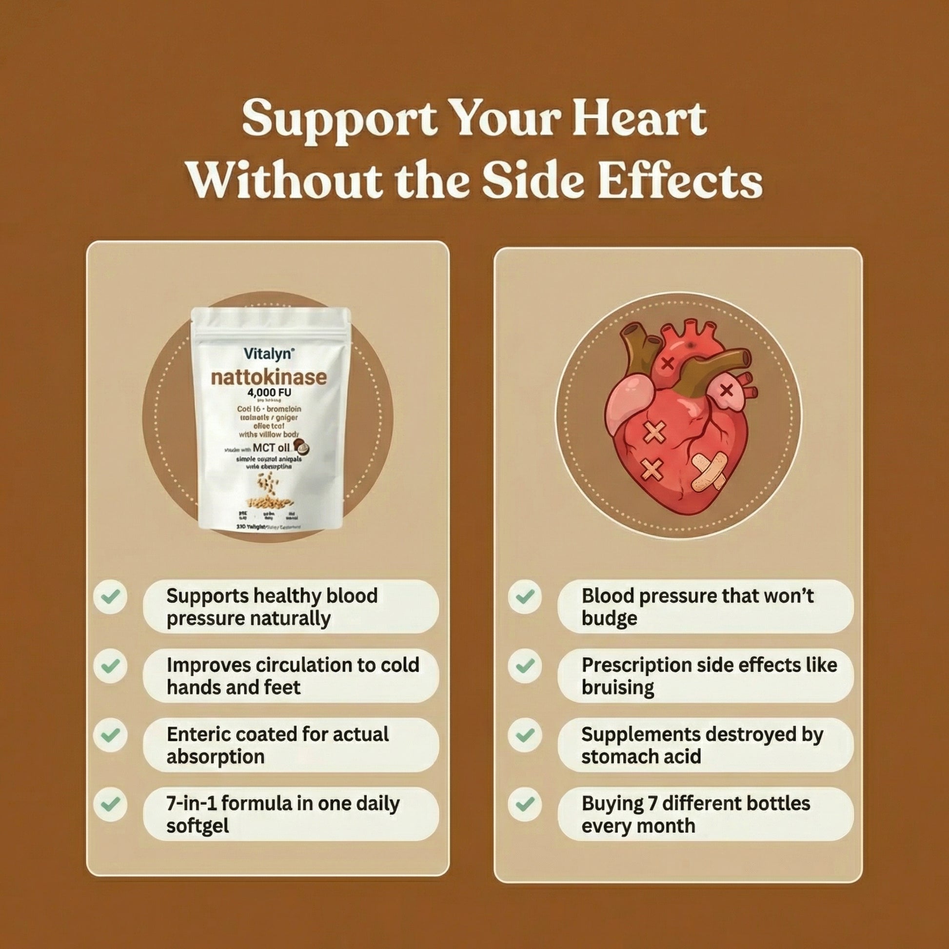 Three reasons. First, we're the only enteric-coated nattokinase — most brands get destroyed by stomach acid before absorbing. Second, 4,000 FU is 2X the strength of most competitors. Third, our 7-in-1 formula includes CoQ10, bromelain, turmeric, ginger, olive leaf, and white willow bark so you're not buying them separately.