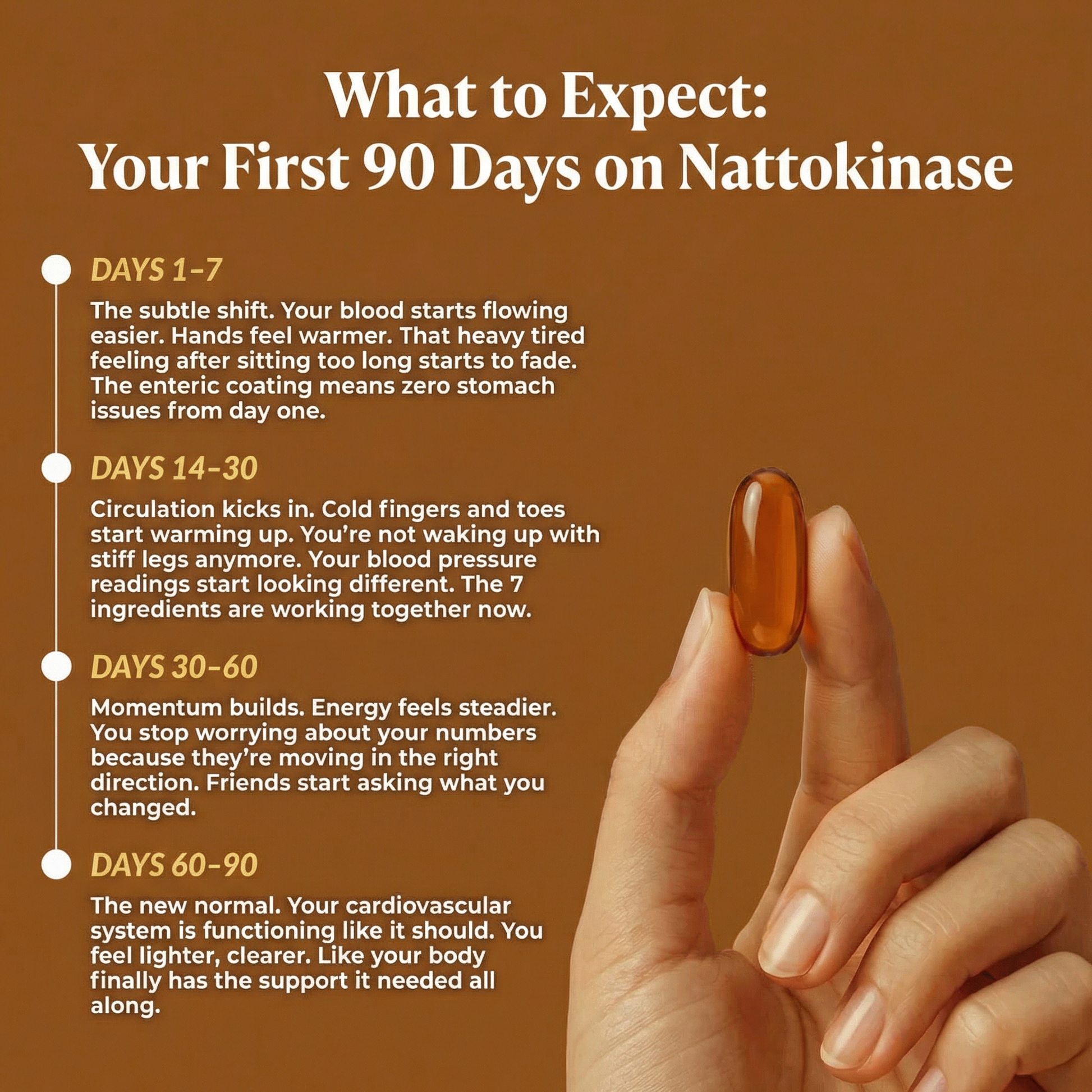 Most customers feel circulation changes within 1-2 weeks. Warmer hands and feet come first. Blood pressure improvements typically show by week 3-4. Full cardiovascular support builds over 60-90 days of consistent use.